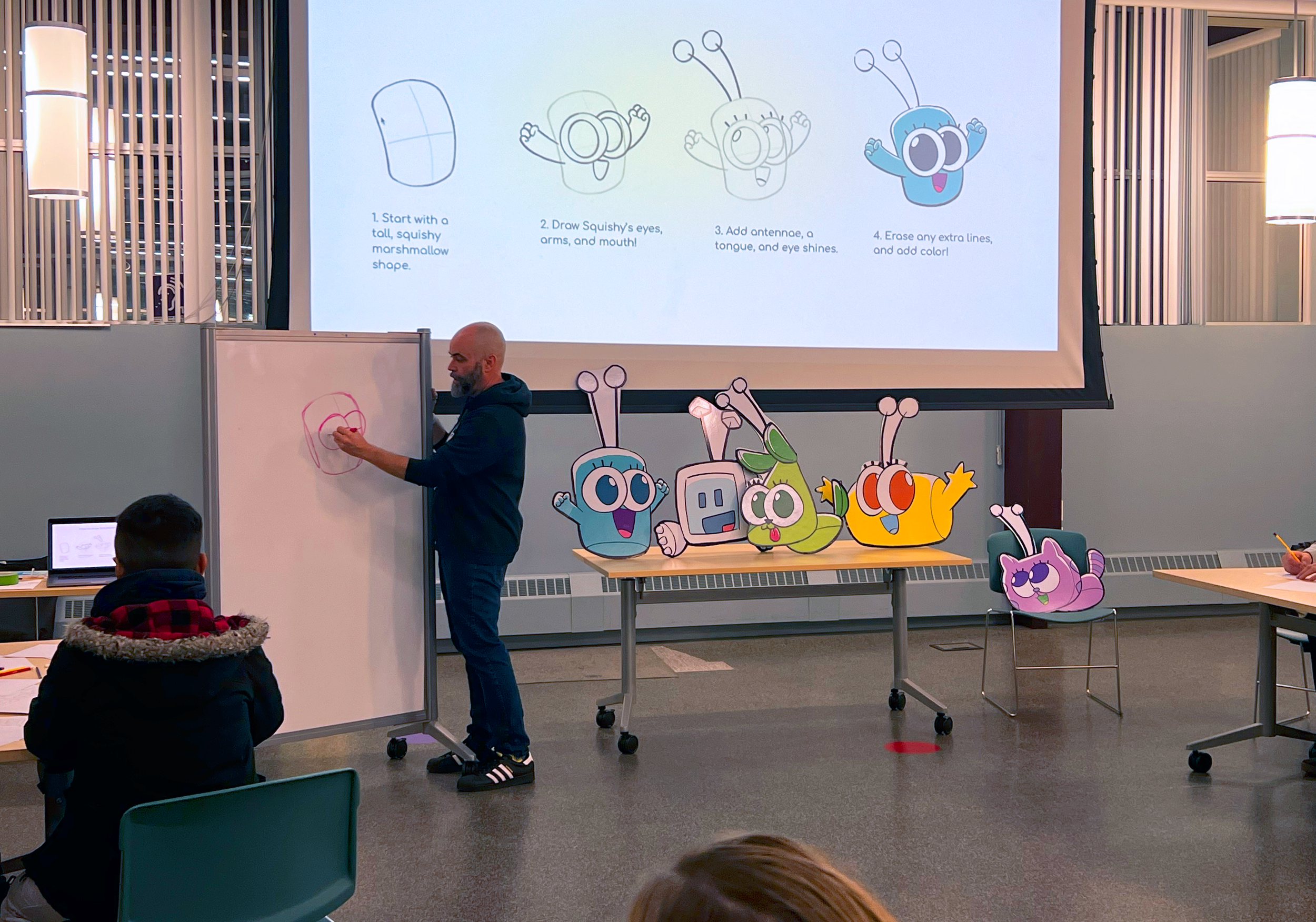 Deanna and Neil led a workshop for newcomer families in our Story As Community program this fall. They quickly won over both children and parents through their welcoming and inviting facilitation style! During our end of program sharing circle, one girl shared how her favourite memory was "the marshmallows!" Deanna read an excerpt from Marshmallow Martians and Neil taught the group how to draw marshmallow martians and create facial expressions. Deanna and Neil facilitate a space where creativity is promoted and participants of all skill levels can engage in meaningful participation!"