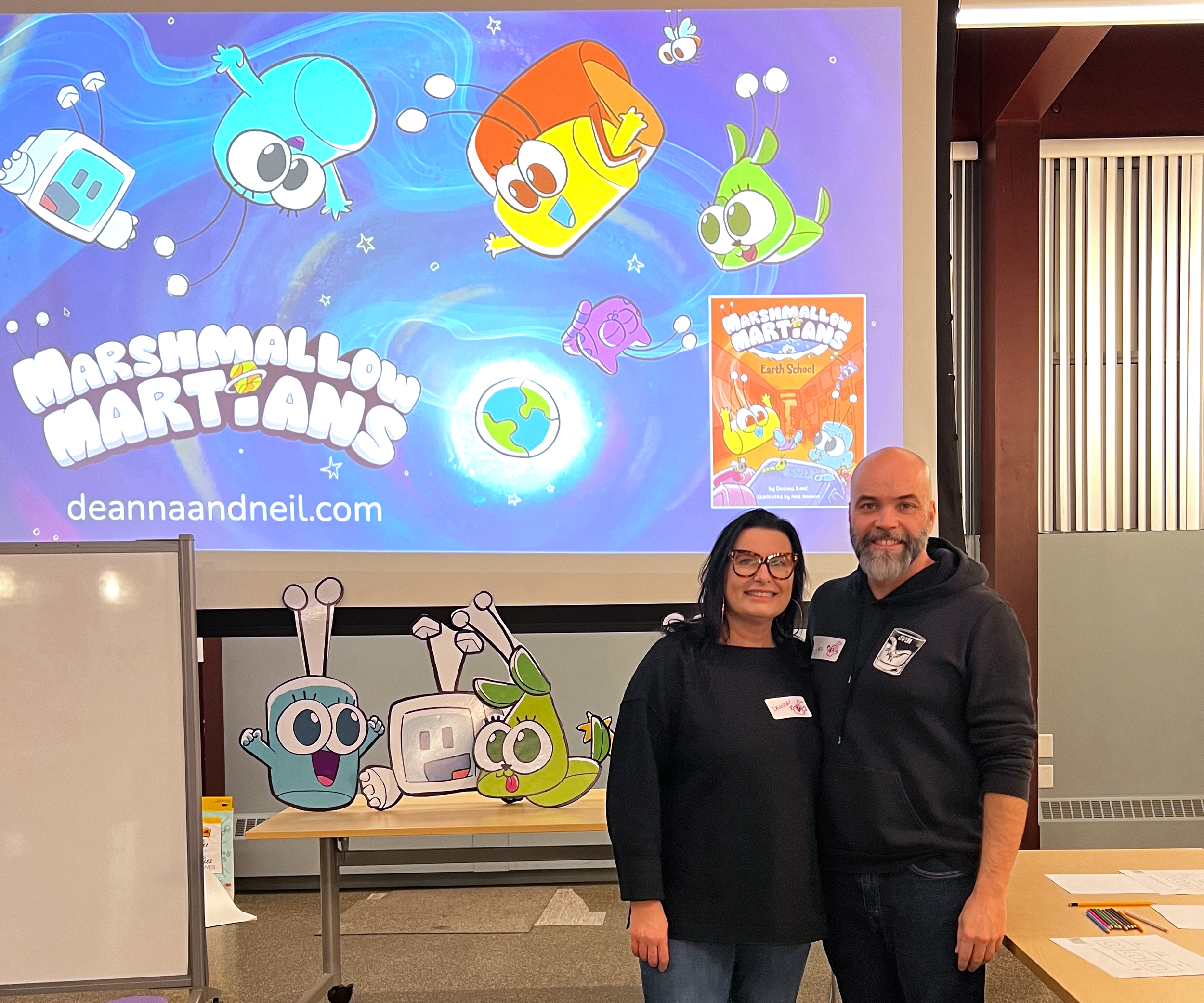 “Deanna and Neil were incredible! For students in our rural/remote community, it was thrilling for our young people to connect with this deeply creative Canadian author/illustrator duo. Student, teacher and administrator feedback was enthusiastic. Many teachers said it was the best author visit they’d ever experienced. Their process was inclusive, inviting and inspiring for young readers. They made time to respond to every student question and comment with genuine interest. We were swamped with requests for a return engagement. The draw-along nature of their presentation was a huge kid with the kids, and engaged readers at all levels of literacy. We were thrilled to invite them for a return visit at the insistence of students.